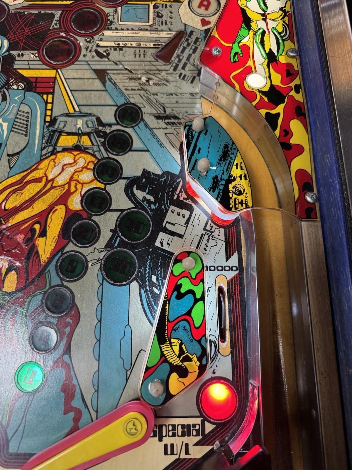 Playfield Artwork – Vividly detailed with futuristic motifs, alien imagery, and card-based designs, enhancing gameplay immersion.